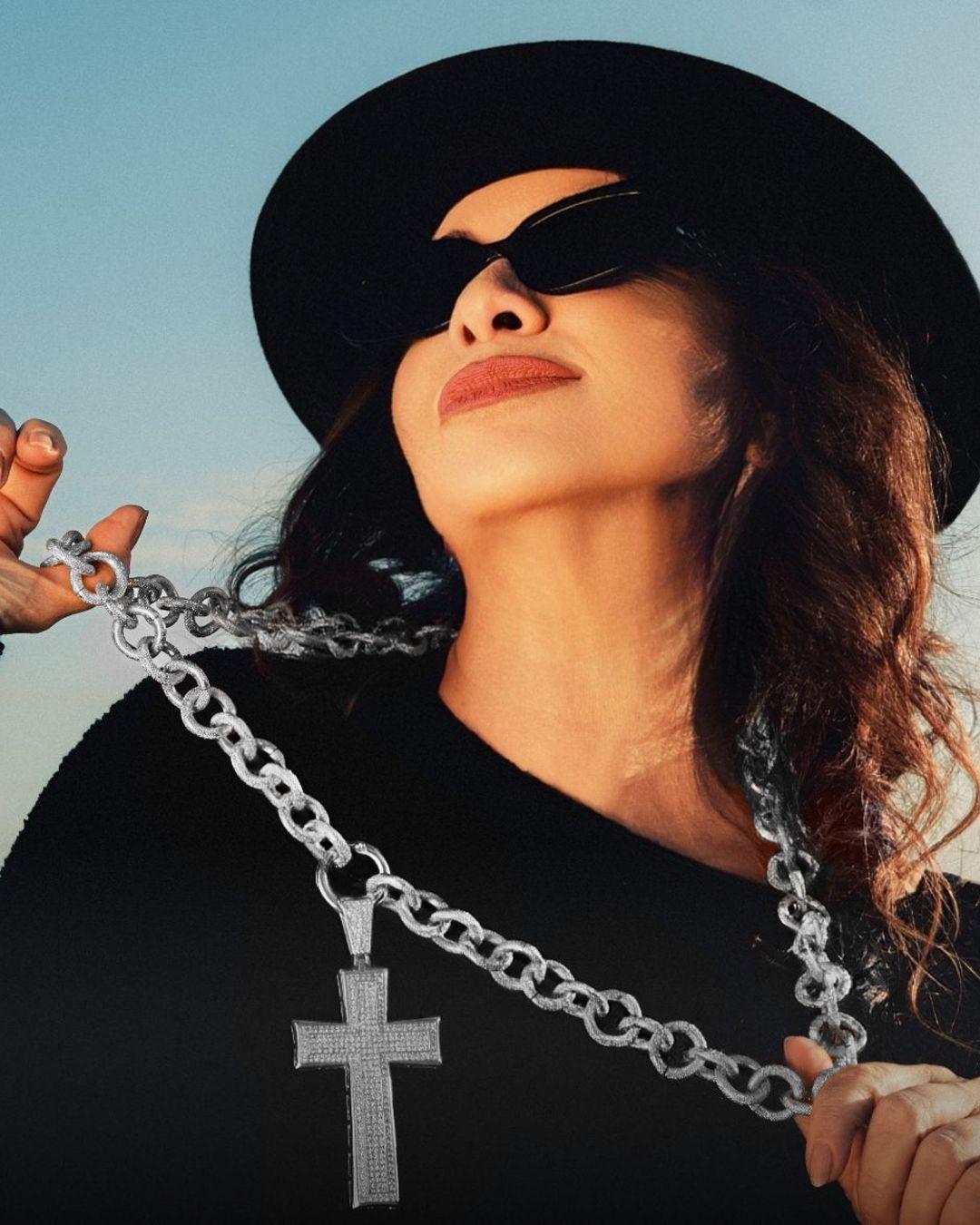 Una collana dallo stile deciso e luminoso, con una croce completamente ricoperta di strass brillanti.