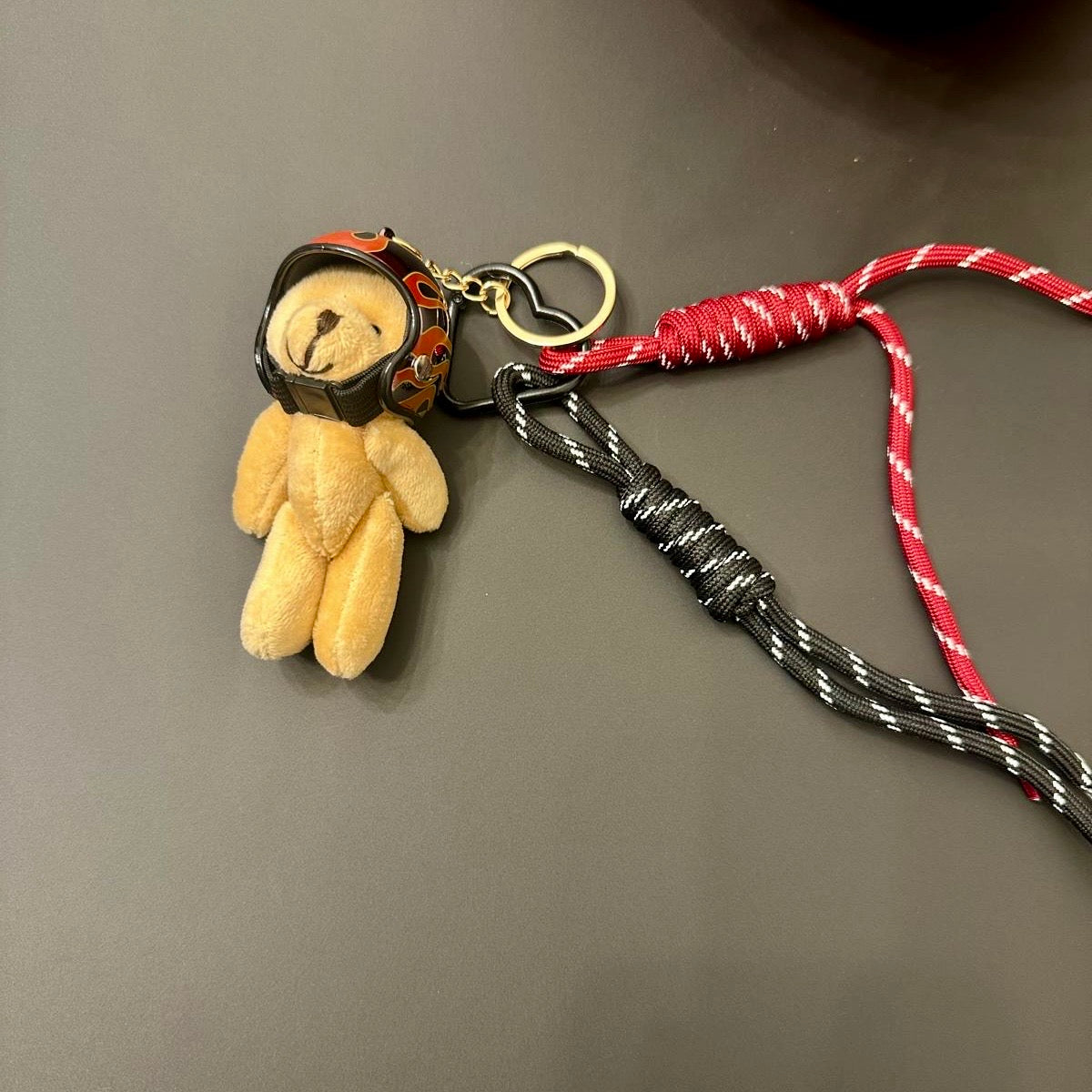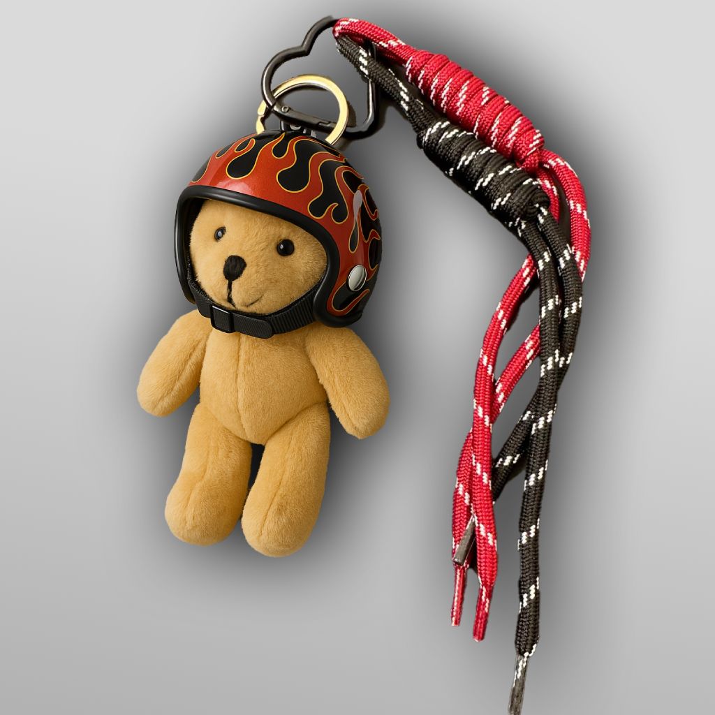 Originalissimo portachiavi con morbido orsetto peluche e mini casco rigido nero e rosso con fiamme gialle, per un look grintoso e super particolare.